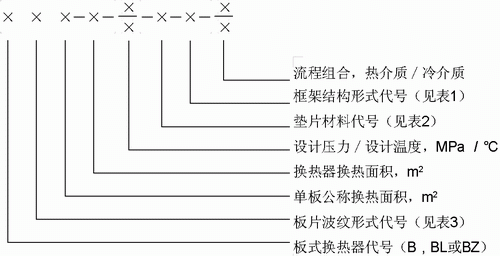 注:1、框架結(jié)構(gòu)形式為 Ⅰ 時,框架結(jié)構(gòu)形式可省略。 2、B-板式換熱器代號;BL-板式冷凝器代號;BZ-板式蒸發(fā)器代號。 3、流程組合都為單時可省略。 |